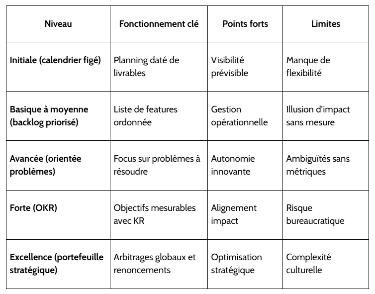 L'objectif ? Vous aider à évaluer votre organisation et à progresser vers une maturité qui transforme la roadmap en levier stratégique d'impact durable.